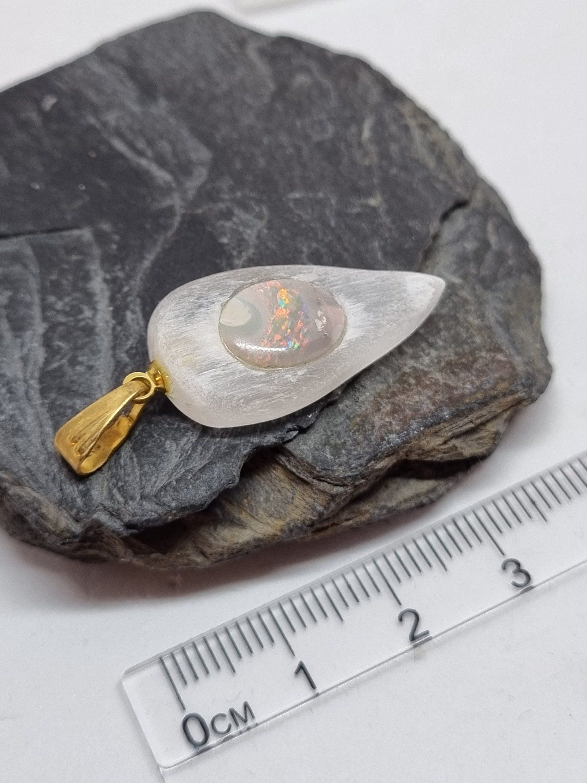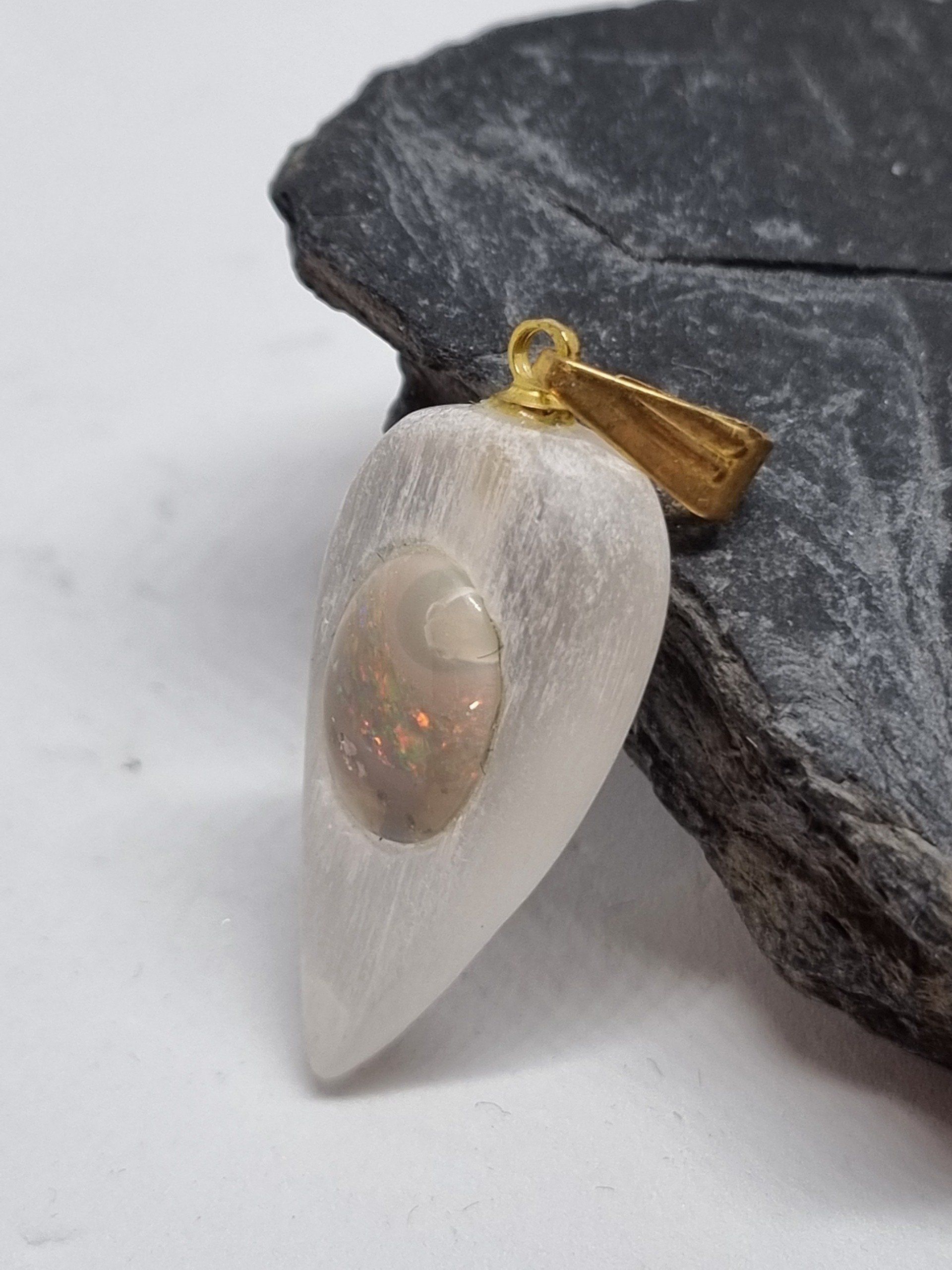 Anhänger: Selenit Tropfen Anhänger mit Opal- inlay