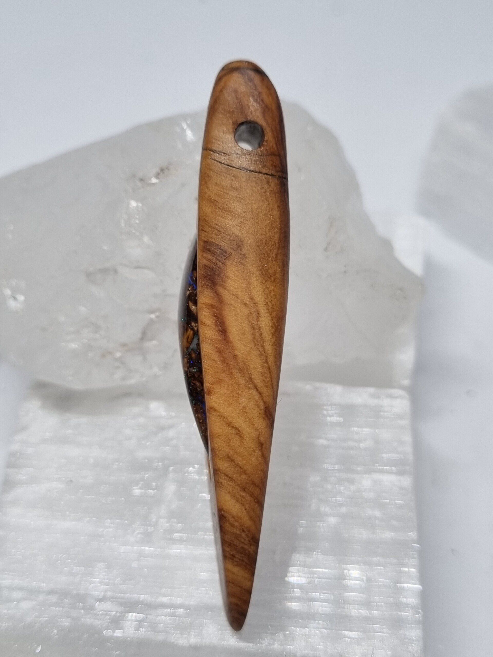 Farbe/Form: Schöner Opal mit blau / grünem Farbenspiel perfekt eingebettet in einer tollen Olivenholzmaserung