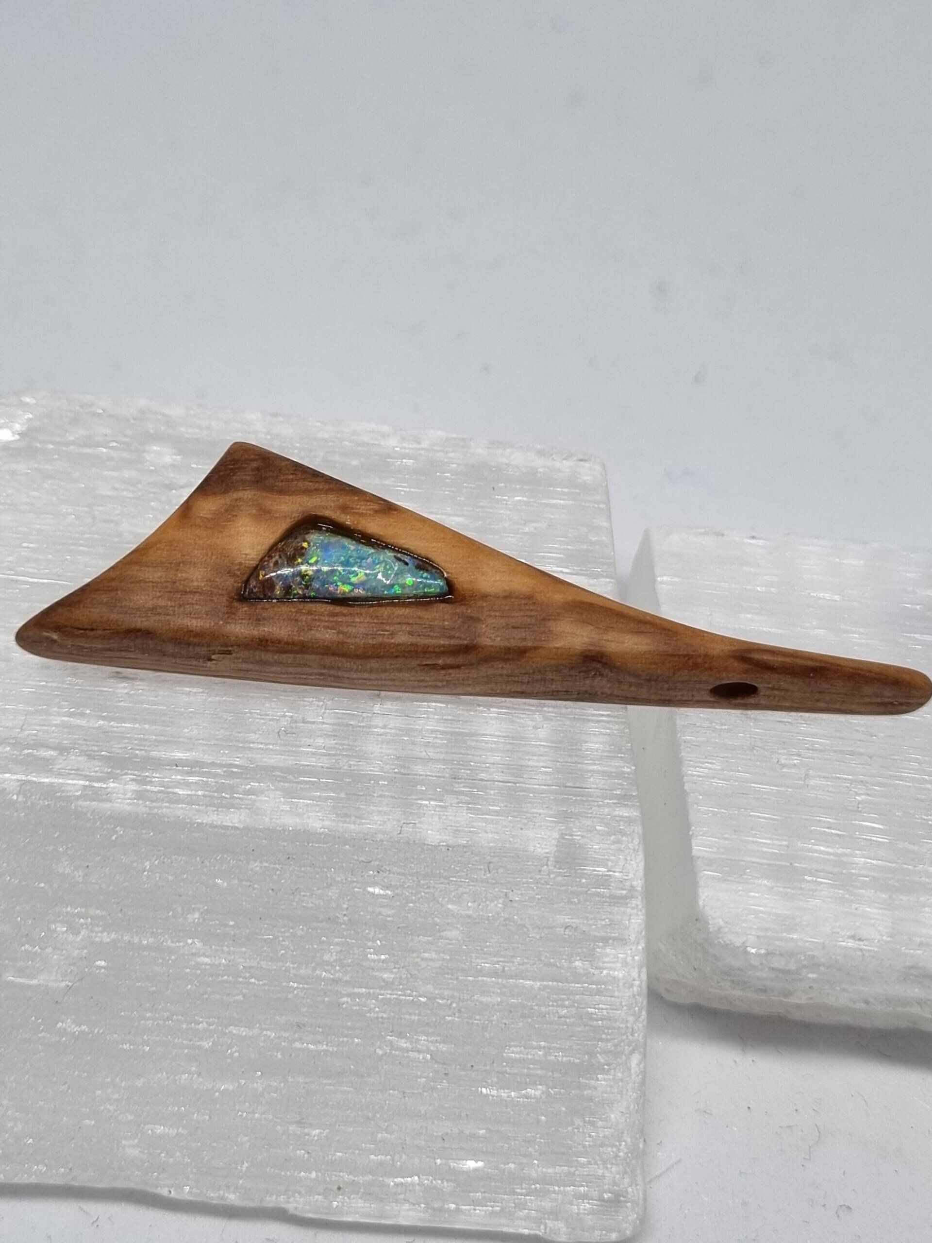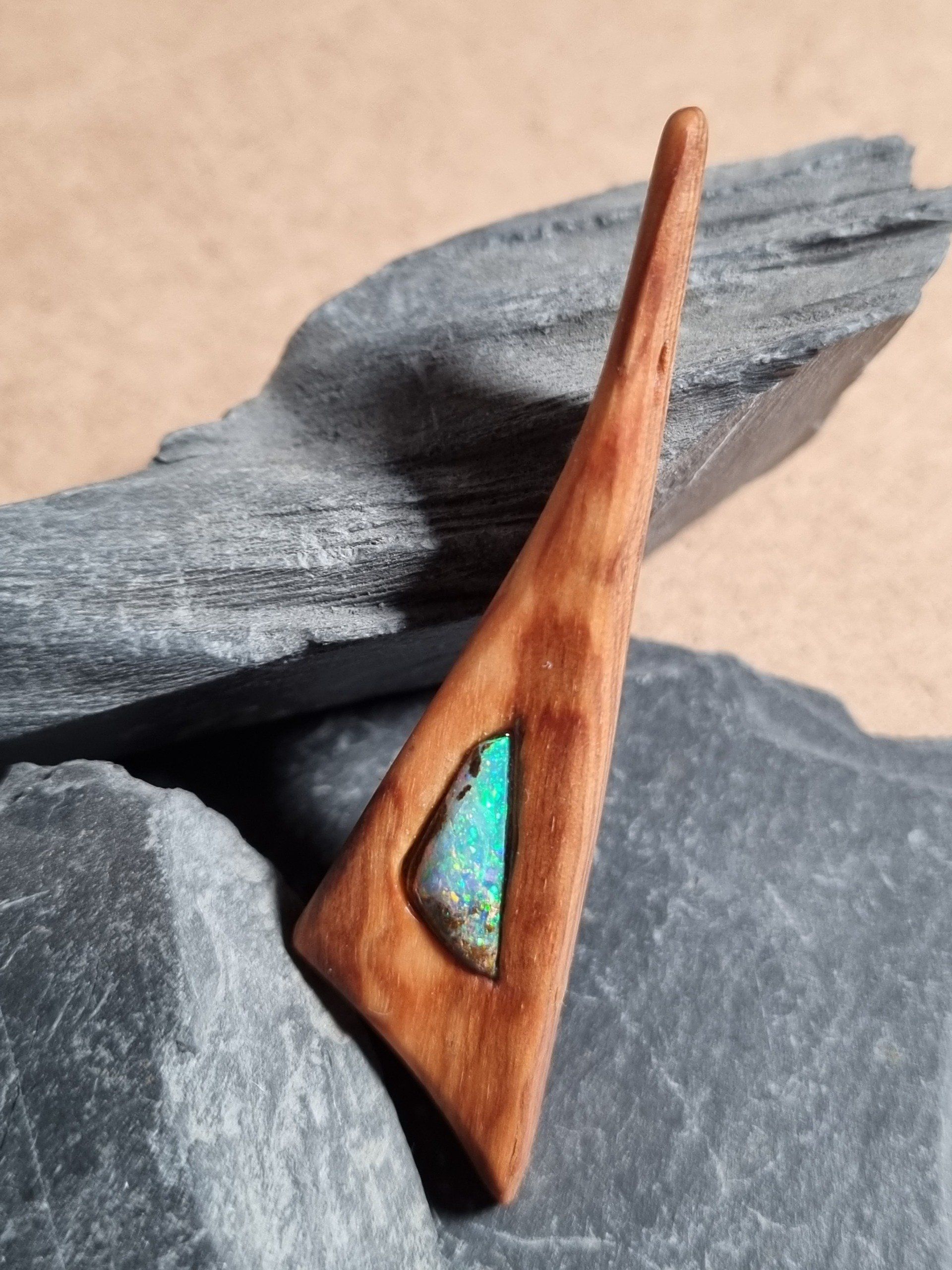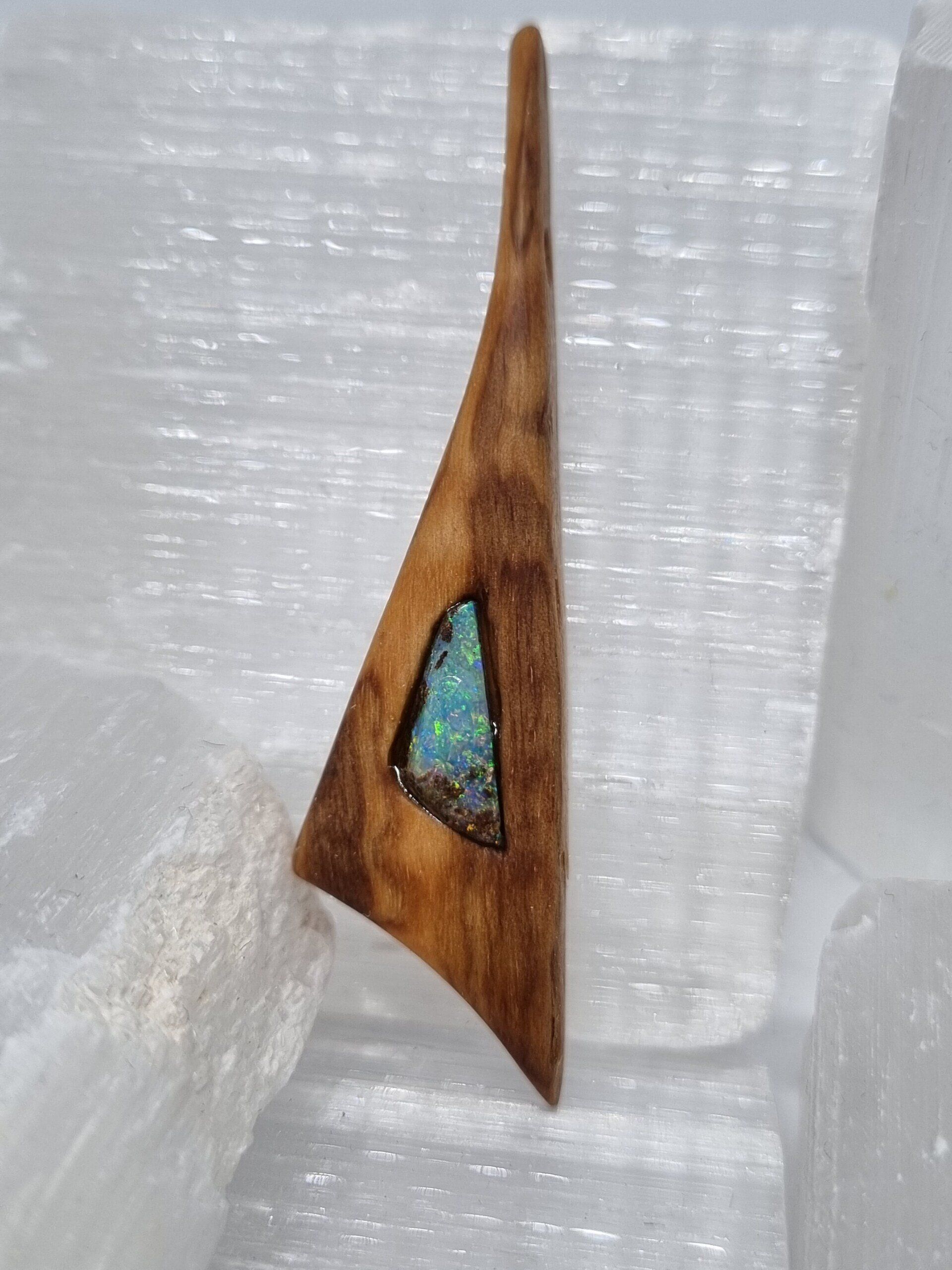 Farbe/Form: Perfekt abgestimmte Holz-Muster mit sehr schönem grün- / blauem Farbenspiel des Opales