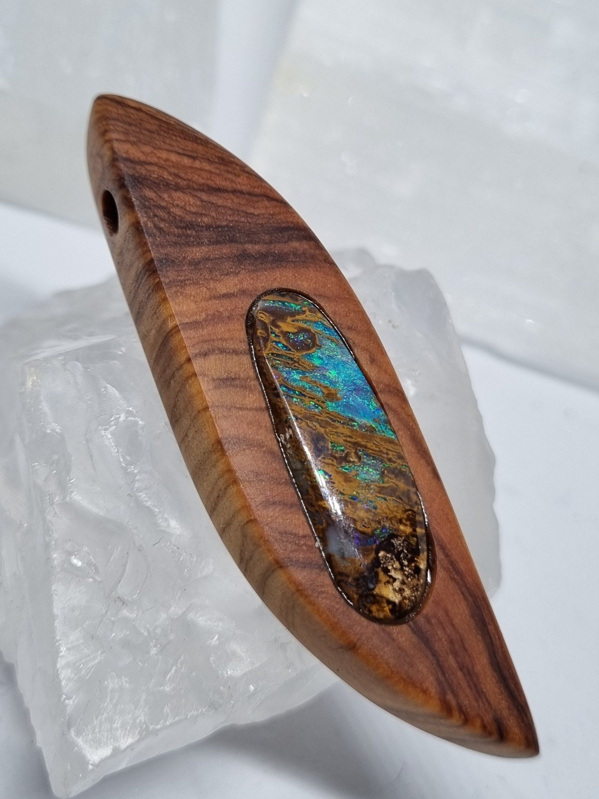 Aufhängung: Olivenholzanhänger länglicher Form seitlich gebohrt.