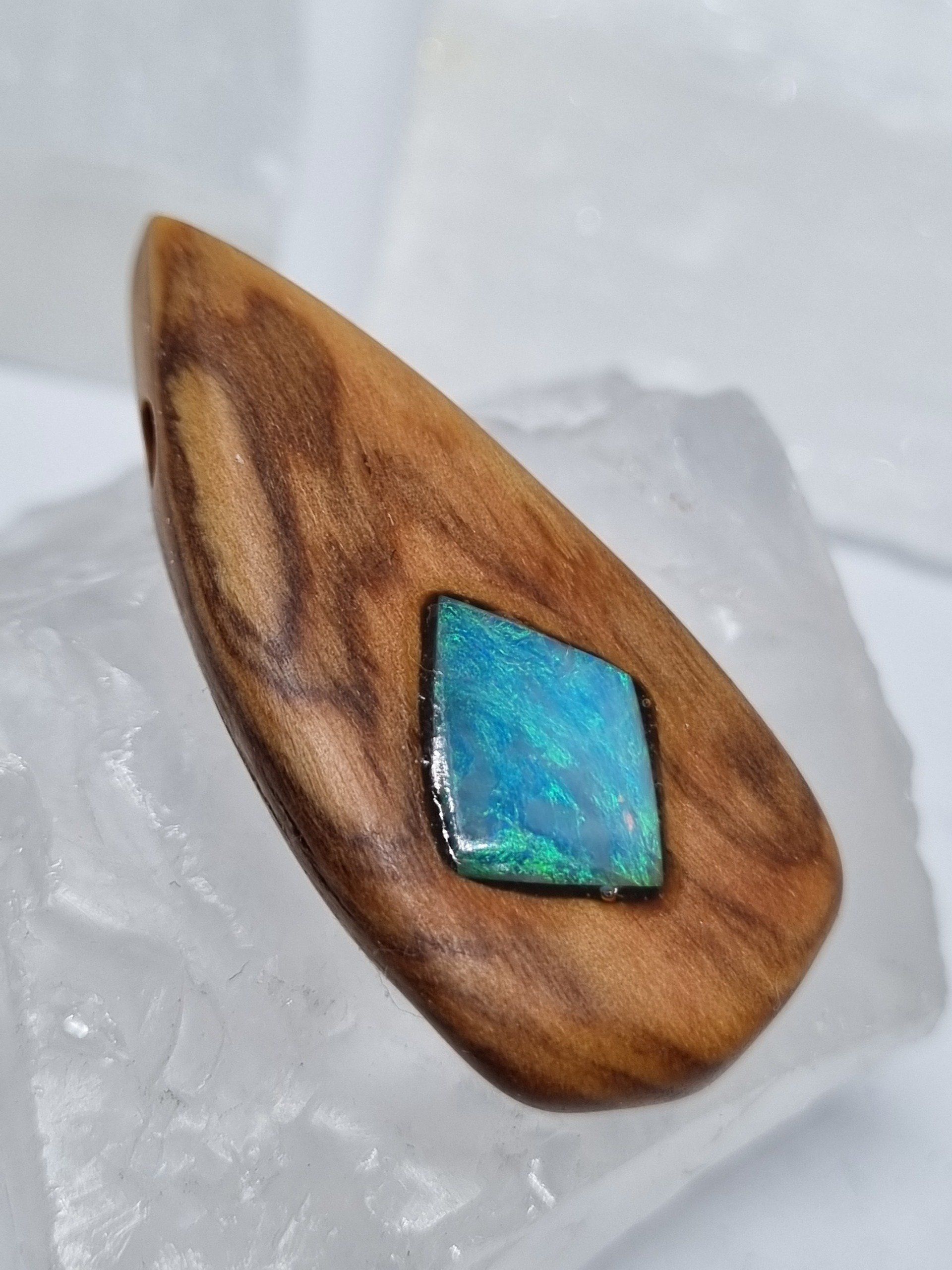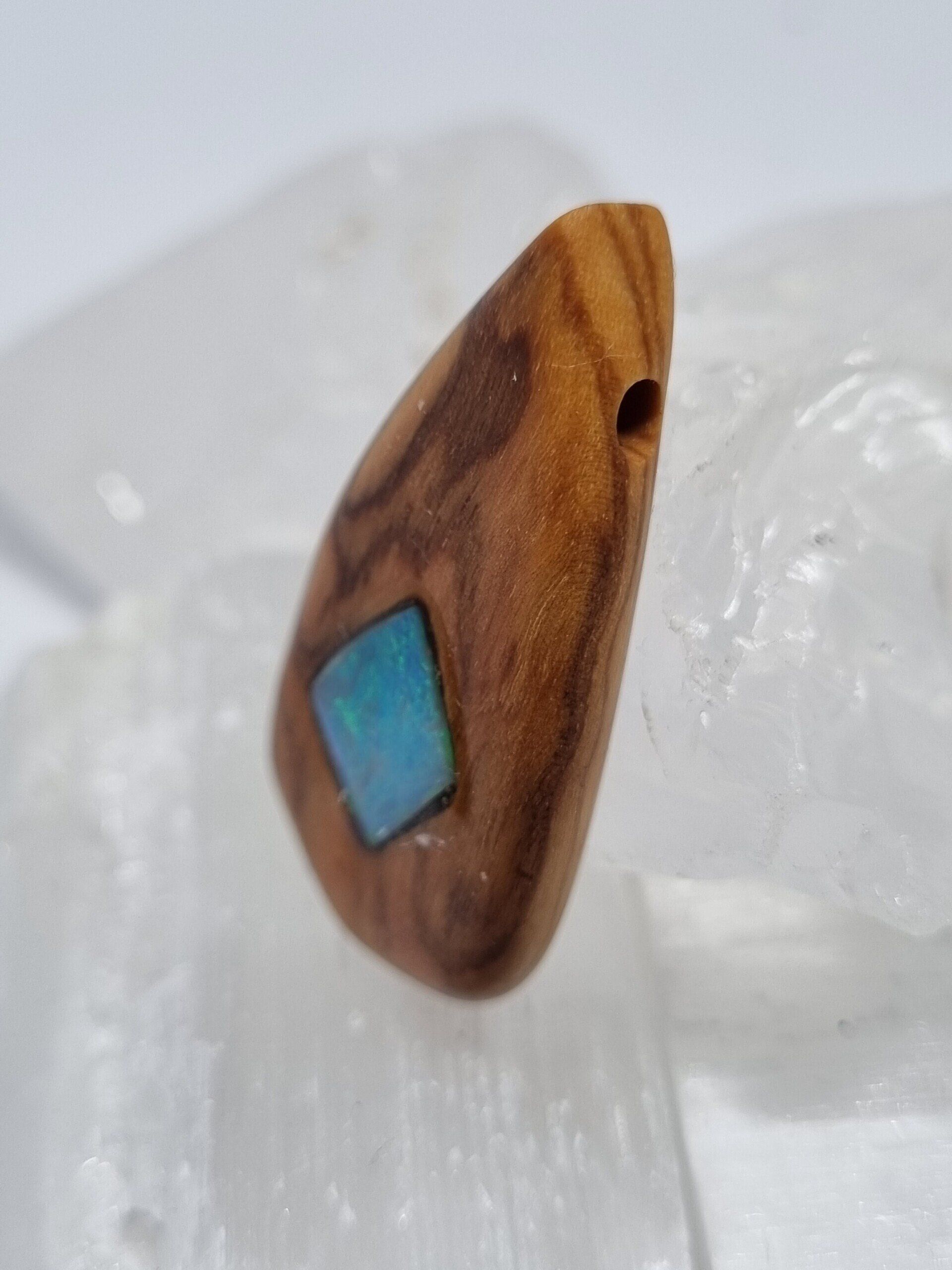 Aufhängung: Olivenholzanhänger in Teardrop Form seitlich gebohrt.
